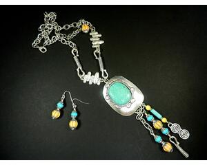 Silver and Turquoise Asymmetrical Pendant Necklace with Yello...