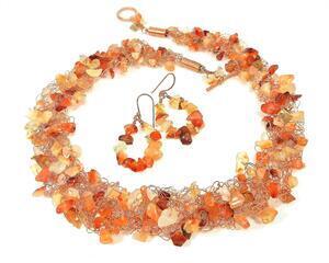 Orange Brown Gold Agate Chip Copper Wire Crocheted Necklace w...
