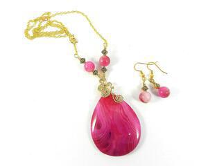 Gold Wire Wrapped Pink Agate Teardrop Gemstone Pendant Neckla...