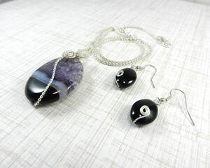 Silver Wire Wrapped Purple and Black Onyx Pendant Necklace wi...