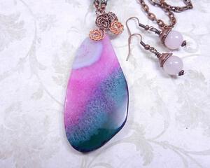 Green and Pink Agate Gemstone Copper Wire Wrapped Pendant wit...