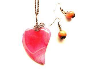 Pink Banded Agate Heart Copper Wire Wrapped with Pink and Ora...