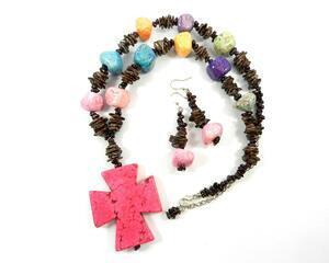 Pink Turquoise Cross and Fossil Rock Necklace with Matching E...