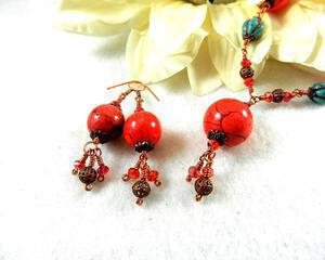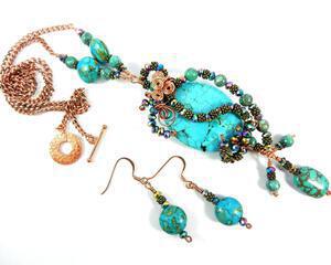 Copper Wire Wrapped Oval Turquoise Gemstone with Jasper Beads...