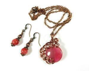 Copper Wire Wrapped Round Dark Pink Agate Pendant with Matchi...