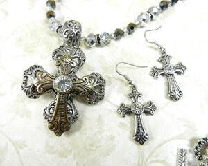 Silver Cross Pendant with a Crystal Necklace and Matching Cro...