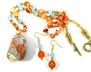 Orange and Blue Agate Pendant Gemstone Gold Necklace with Mat...