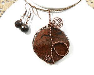 Round Beveled Brown Jasper Pendant Copper Wire Wrapped with C...