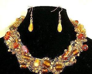Gold Wire Crocheted Necklace with Amber Art Glass and Wood Be...