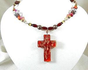 Red Copper and Gold Art Glass Lamp Work Cross and Crystal Nec...