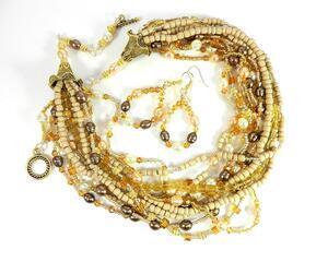 Multi Strand Bead Necklace in Tan and Gold with Glass Pearls ...